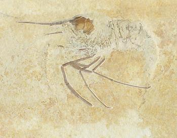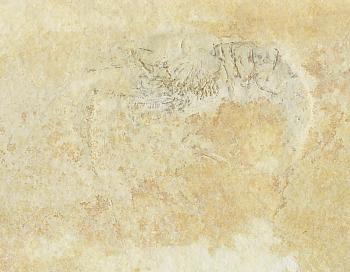 Stücke zerbrochen. Nach dem Kleben der Fossilien erfolgt die Präparation, die fast ausnahmslos mechanisch erfolgt. Um gute Ergebnisse zu erzielen sind jahrelange Erfahrung, gutes Werkzeug, ein gutes Stereo-Mikroskop und sehr, sehr viel Geduld erforderlich. Die Fossilien werden in stundenlanger Arbeit unter dem Binokular Stück für Stück freigelegt. Der Fortgang einer Präparation, die noch nicht abgeschlossen ist, wird hier exemplarisch an einem Schwimmkrebs (Aeger tipularius) dargestellt. Der Bildausschnitt beträgt ca. 17 x 13 cm. |